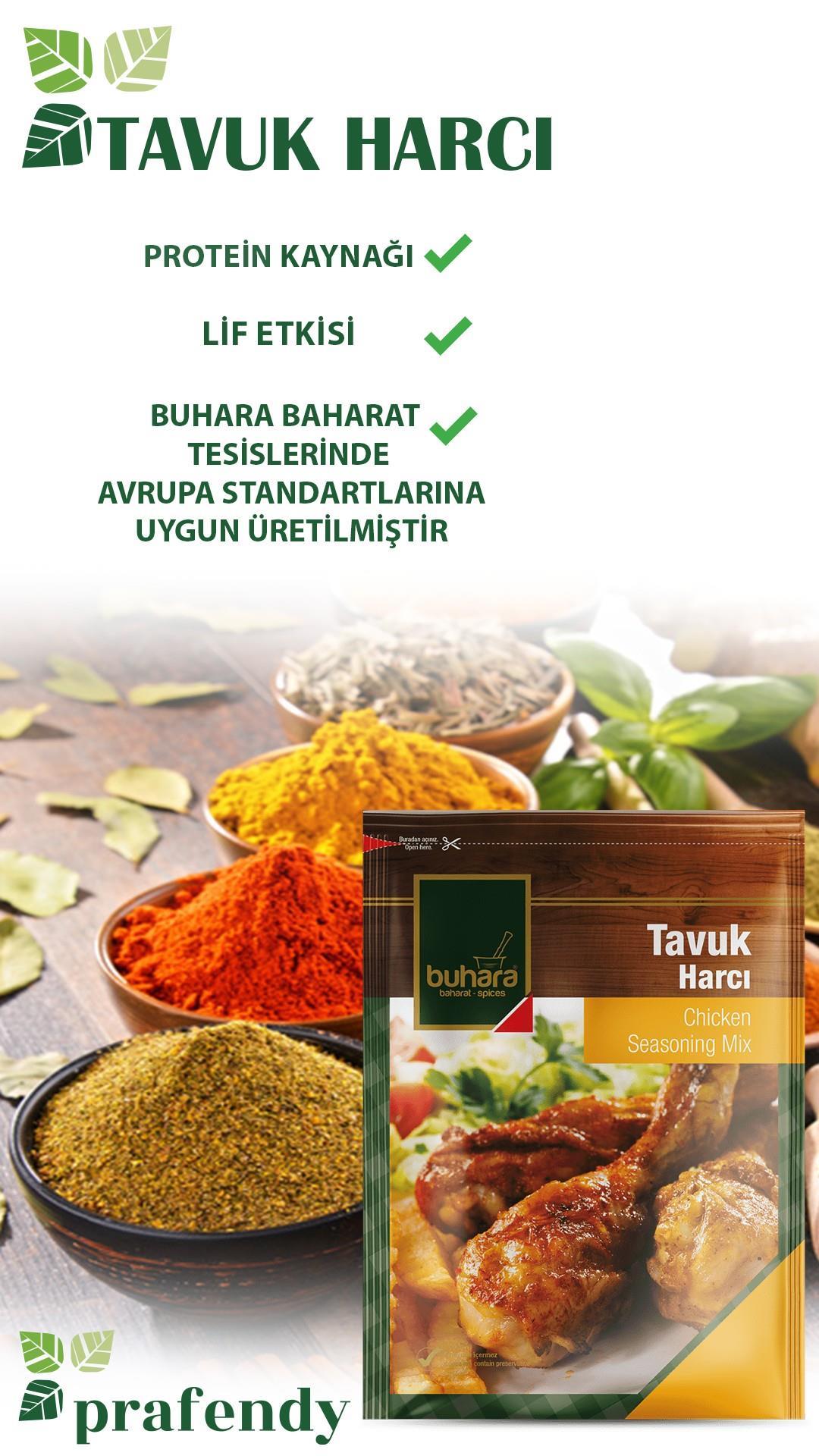 Buhara Baharat Tavuk Harcı hiçbir koruyucu madde içermez. Buhara Baharat Tavuk Harcı ile geleneksel bir lezzet olan tavukları istediğiniz her yerde pratik bir şekilde hazırlayabilirsiniz.